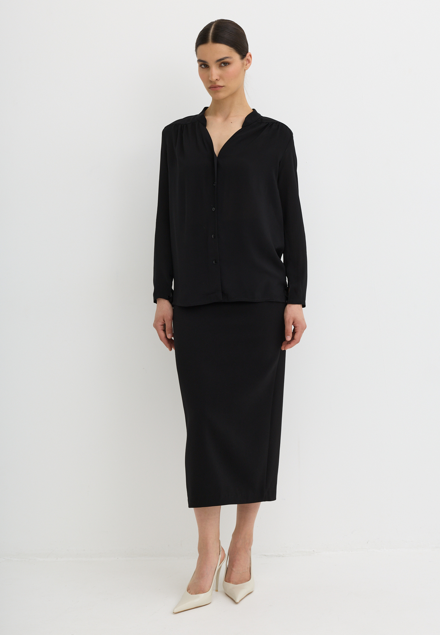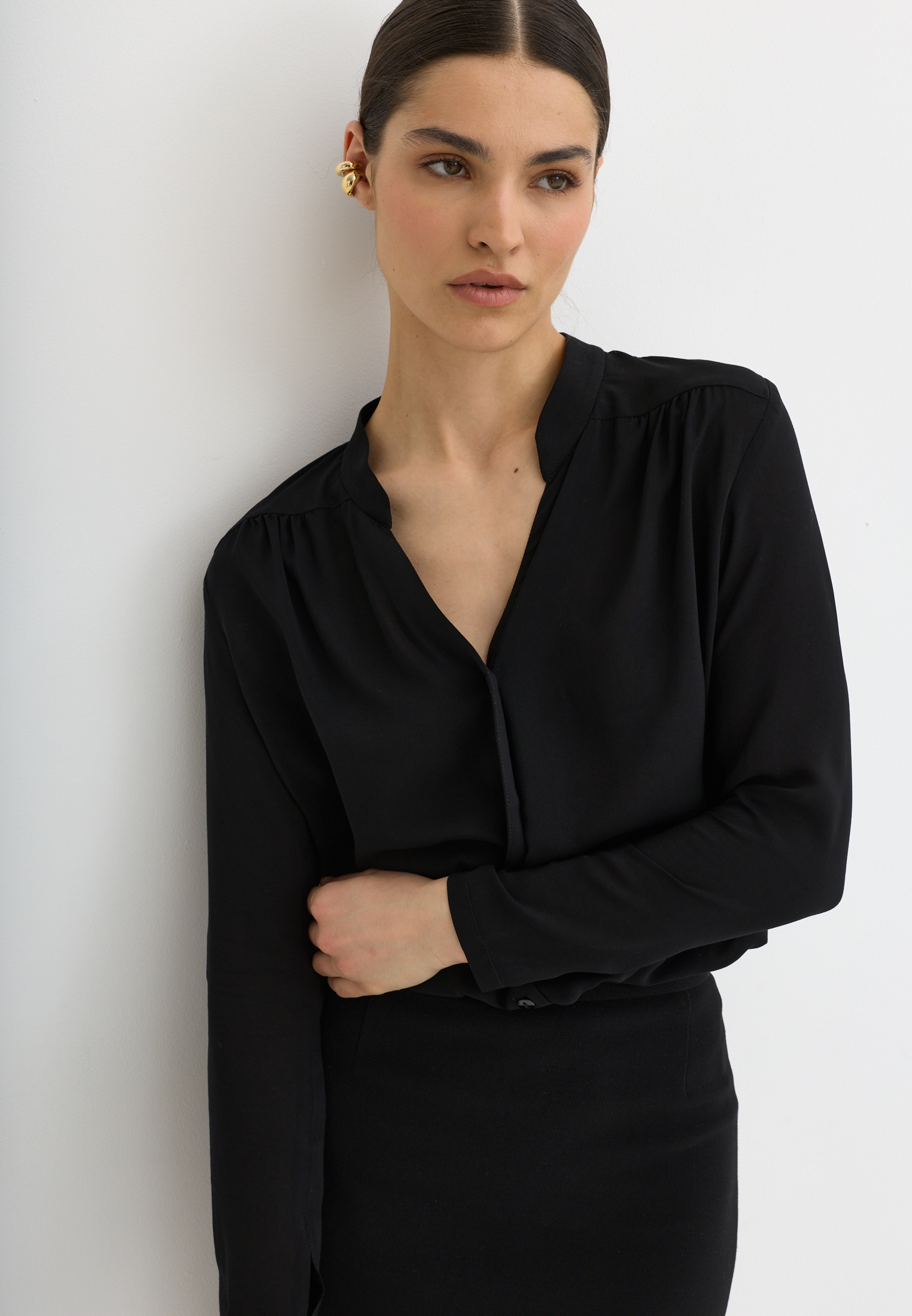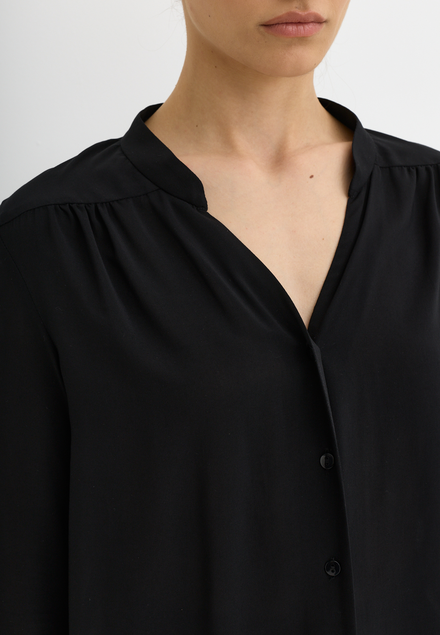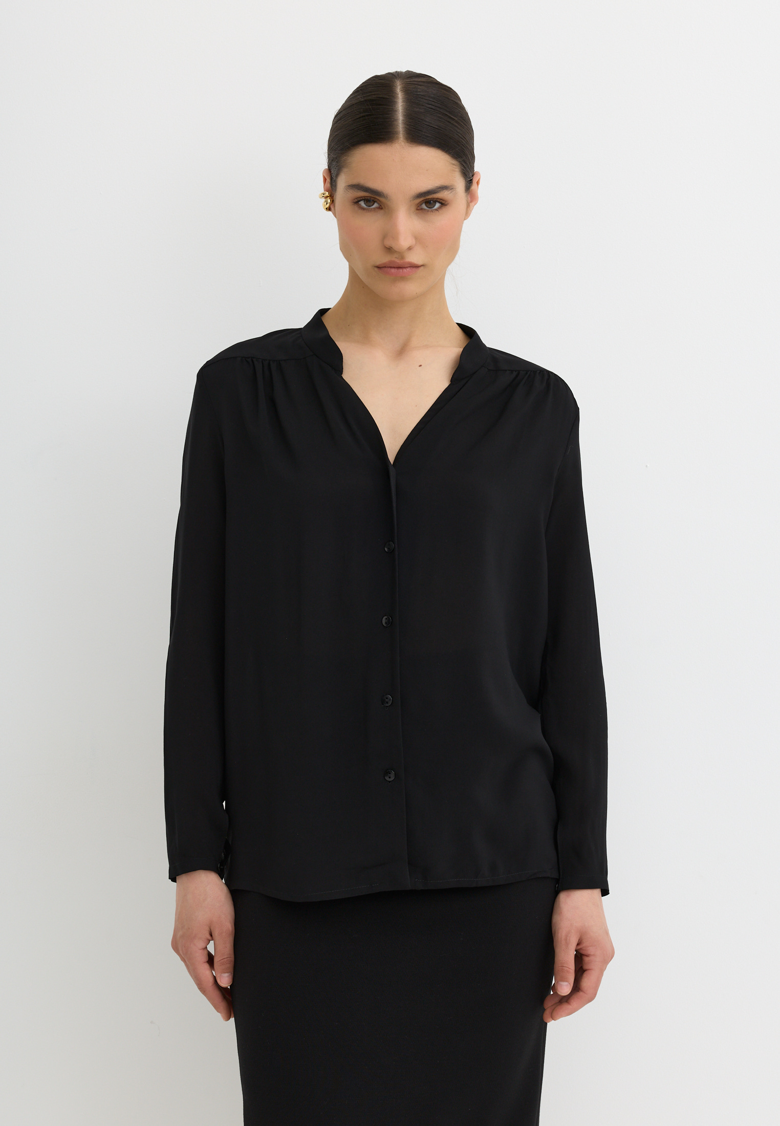 Блуза из 100% вискозы. Воротник стойка. На рукаве выполнен разрез и застежка на пуговицу. Блуза застегивается на пуговицы.