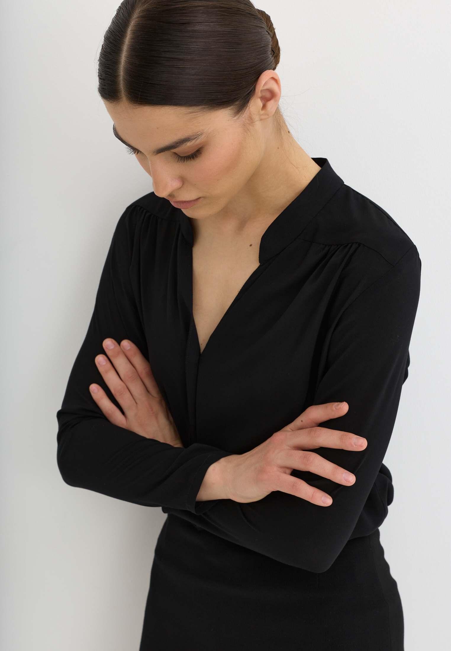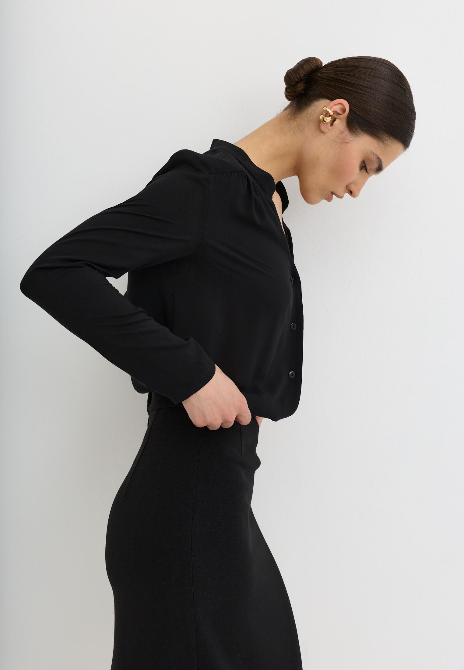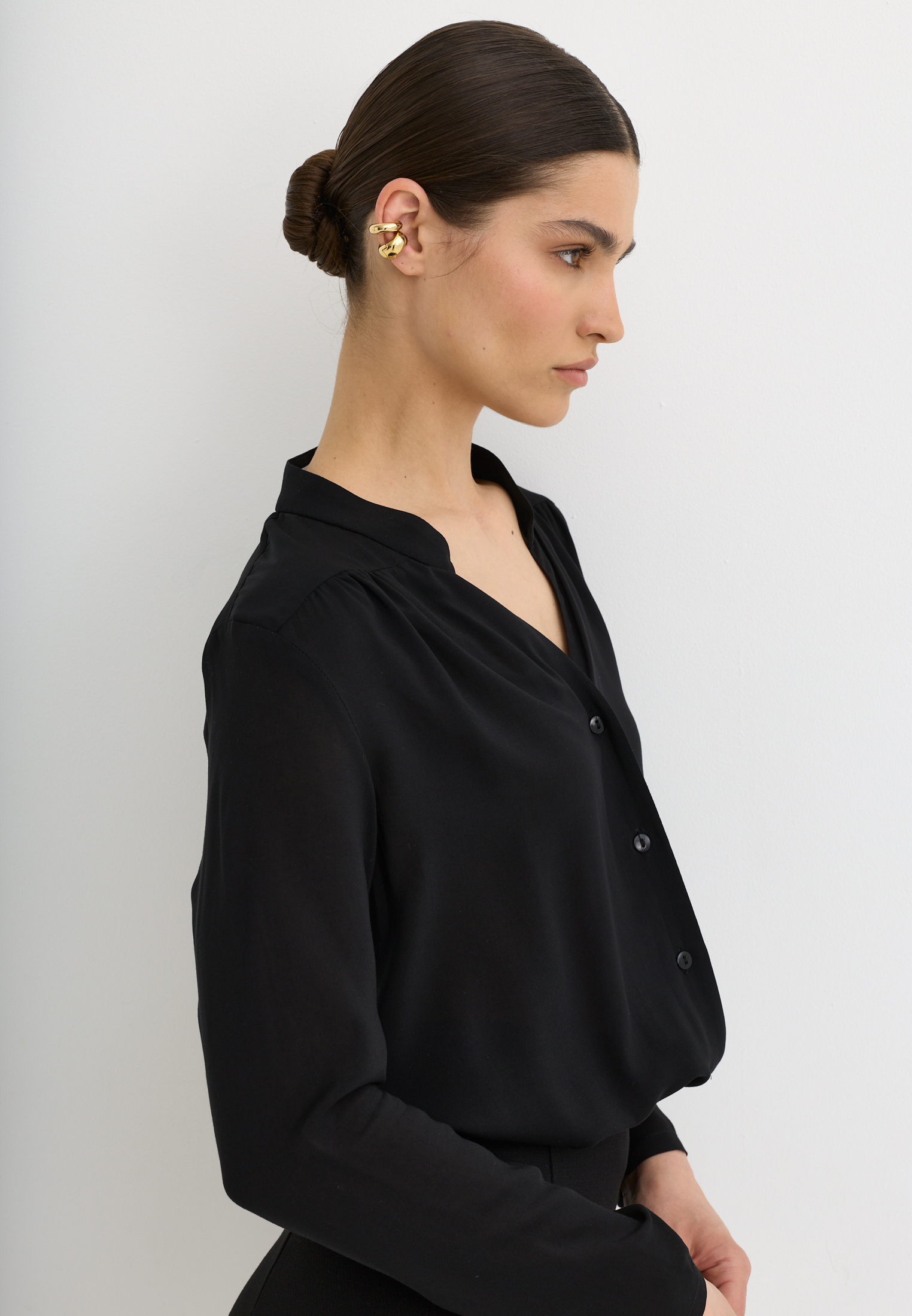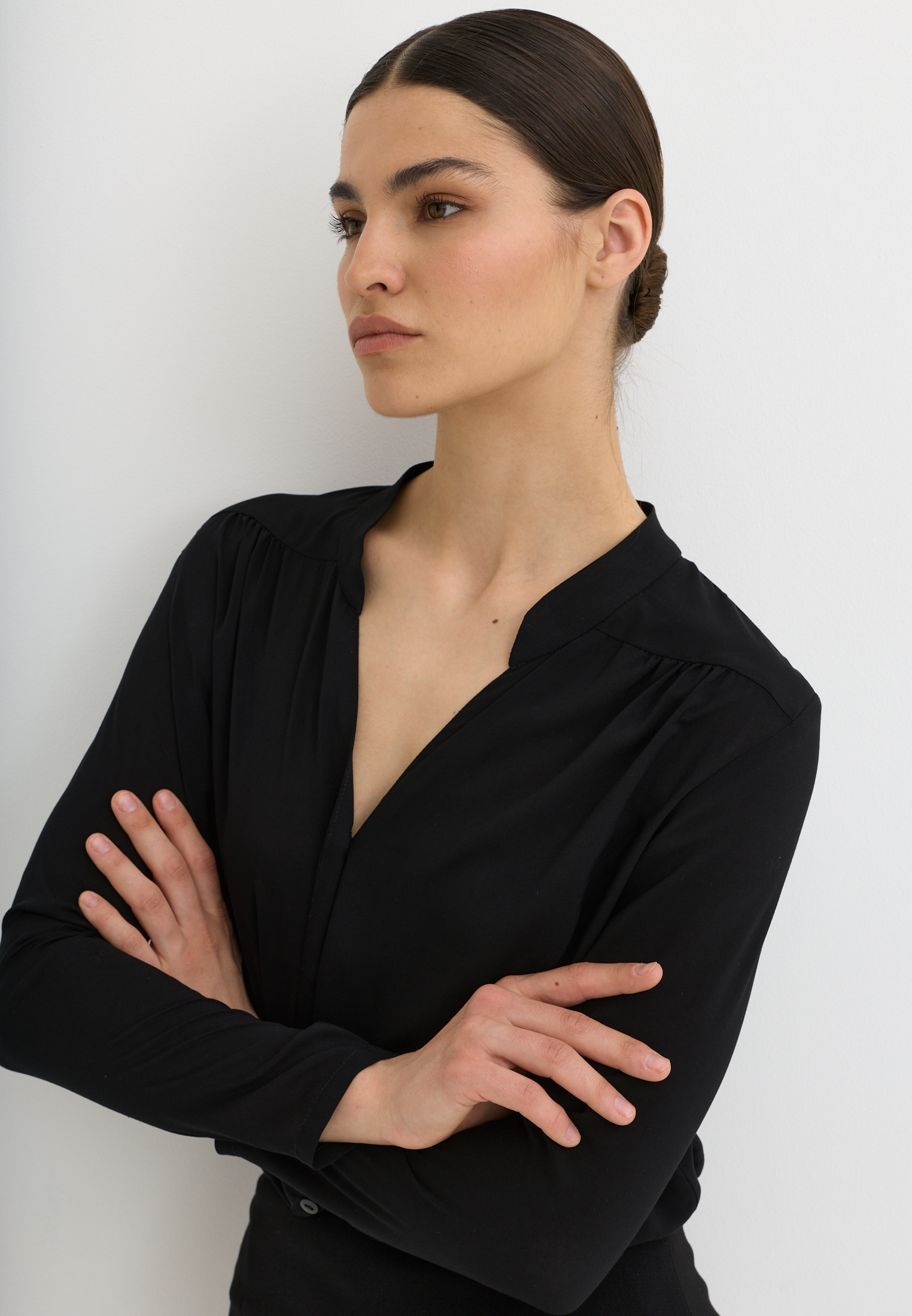 Блуза из 100% вискозы. Воротник стойка. На рукаве выполнен разрез и застежка на пуговицу. Блуза застегивается на пуговицы.