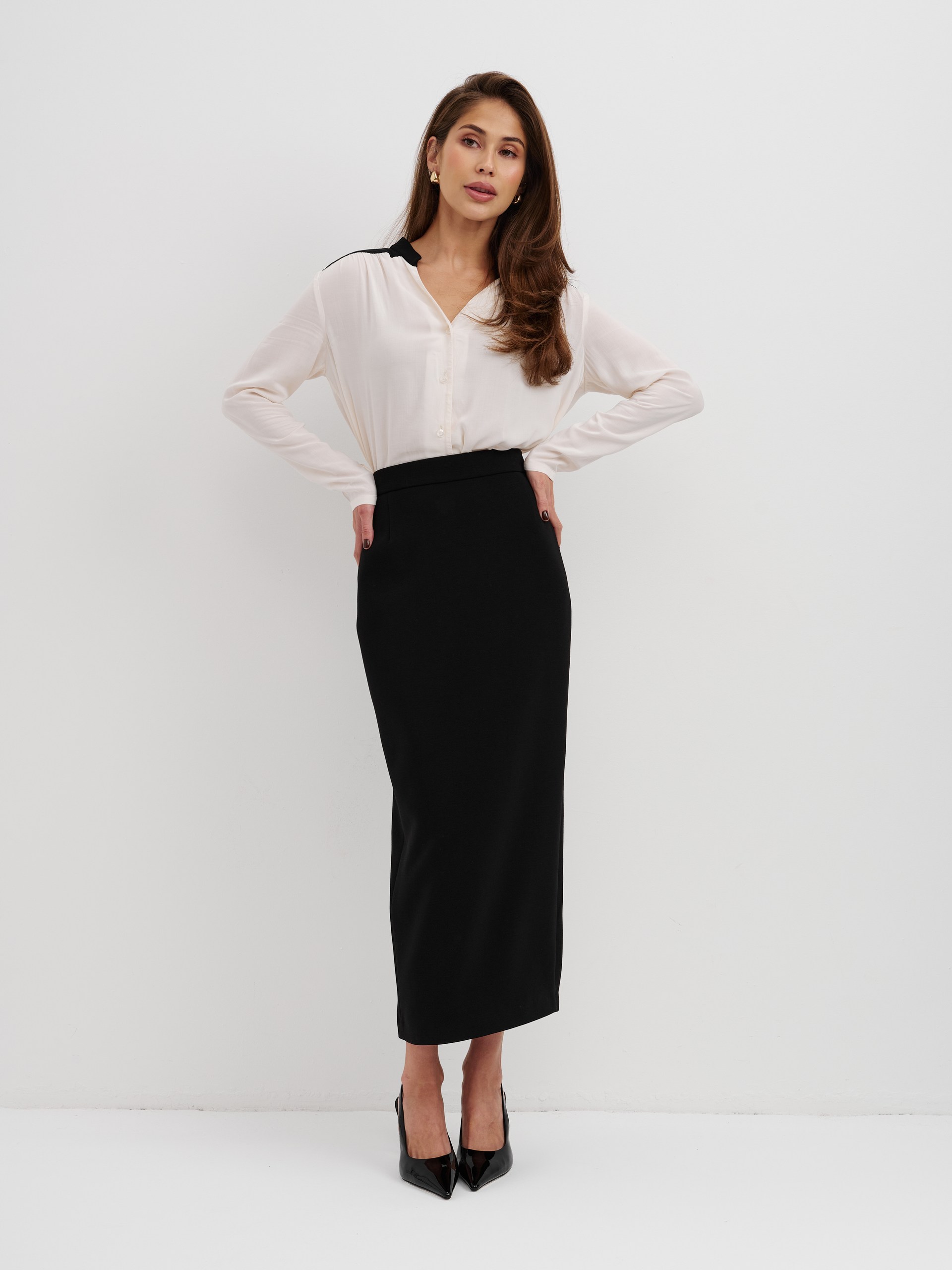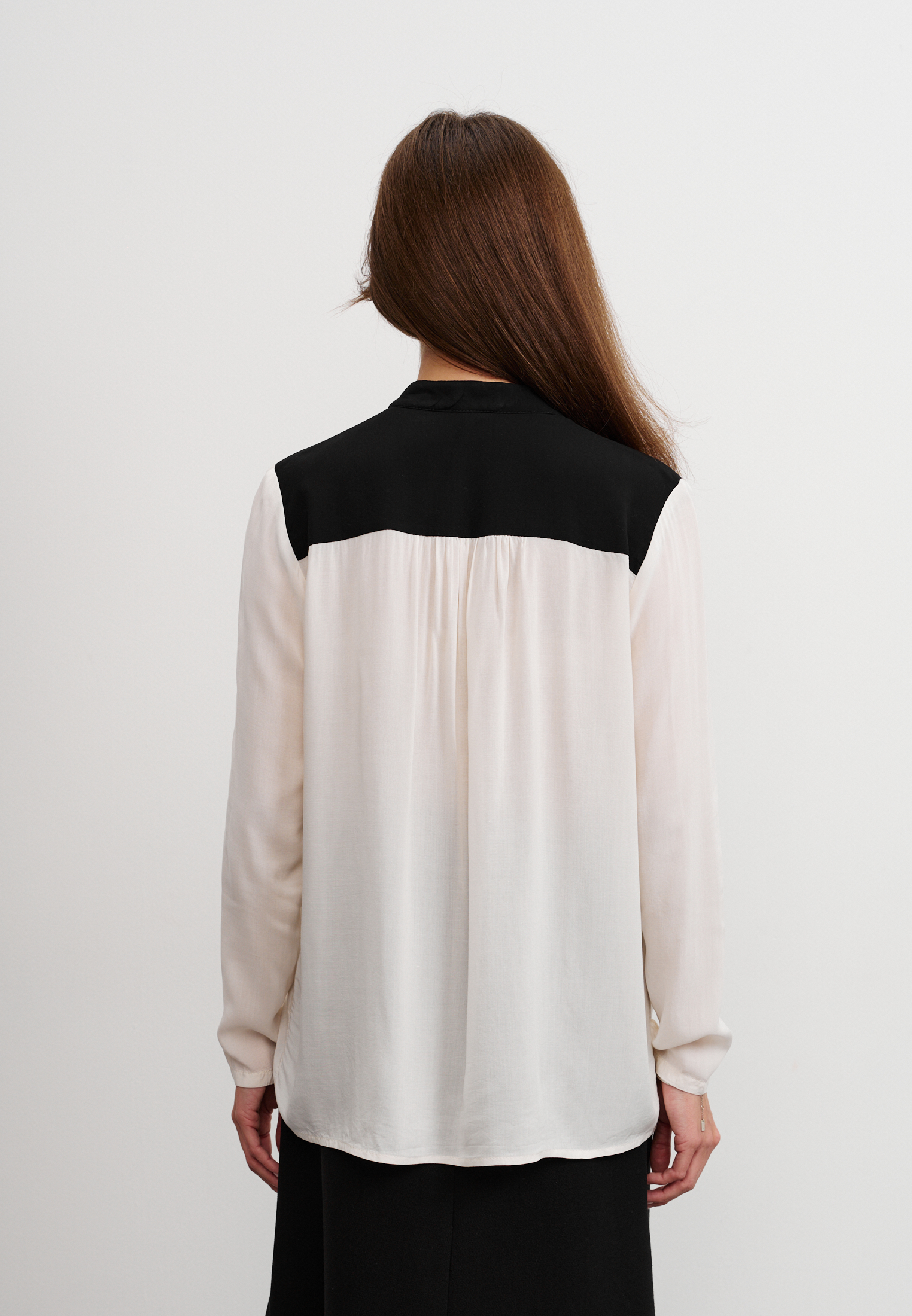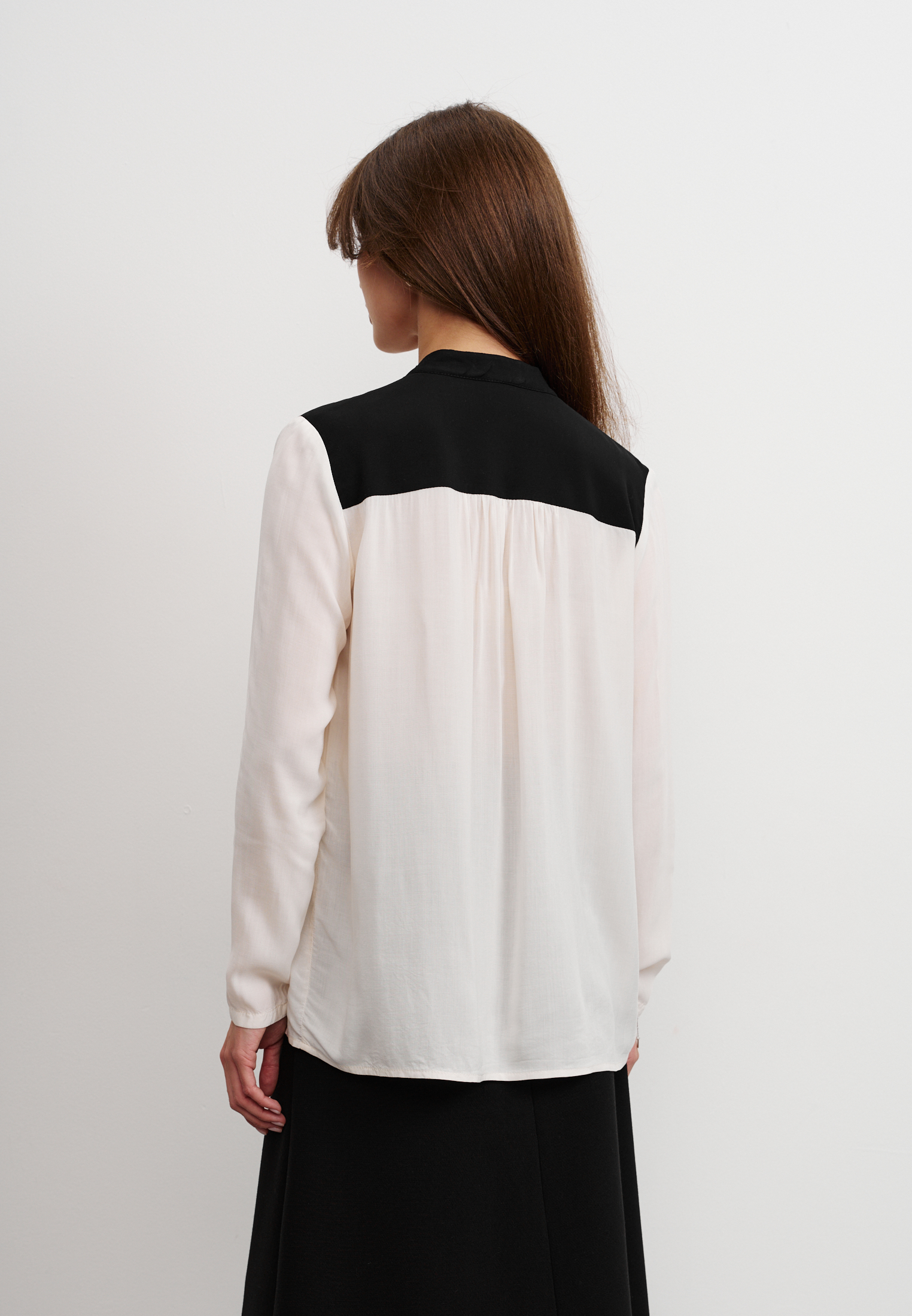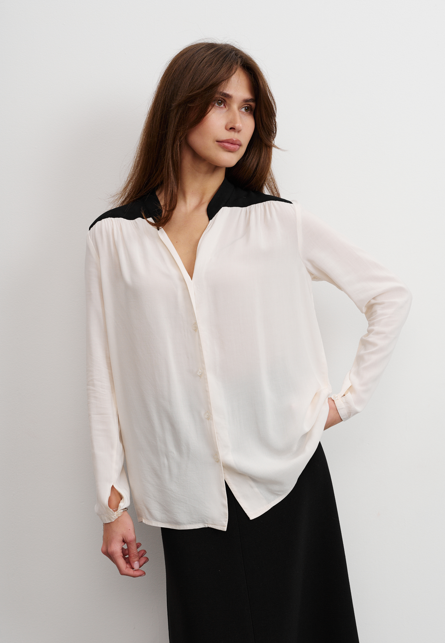 Блуза из 100% вискозы. Воротник стойка плавно перетекает в акцентную планку выполненную в черном цвете. На рукаве выполнен разрез и застежка на пуговицу. Блуза застегивается на пуговицы.