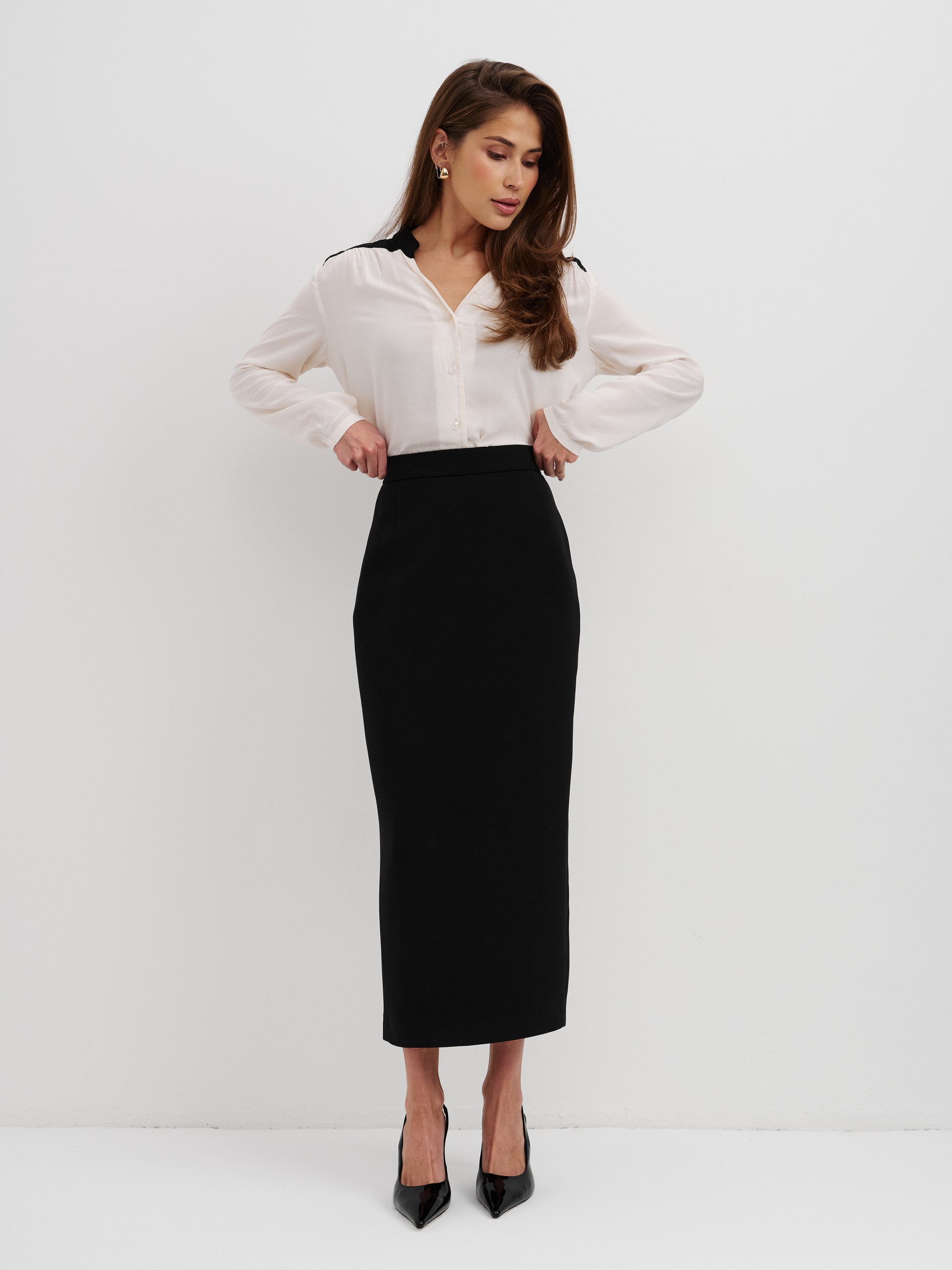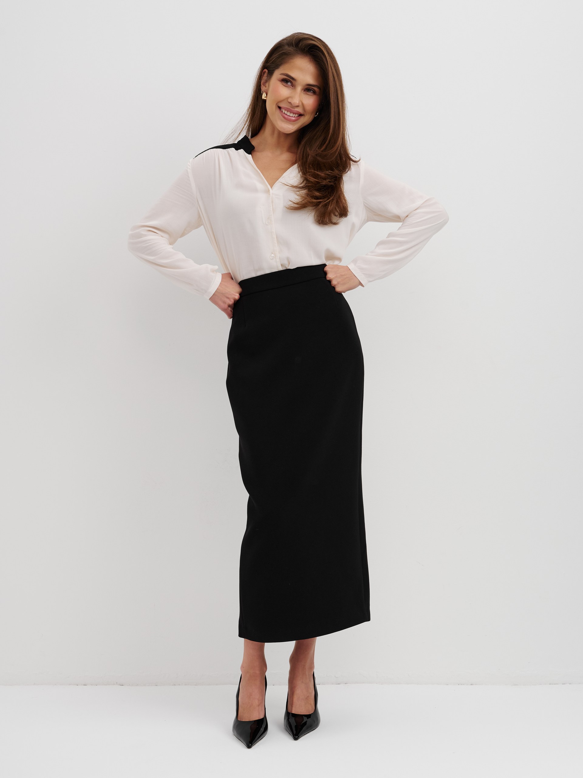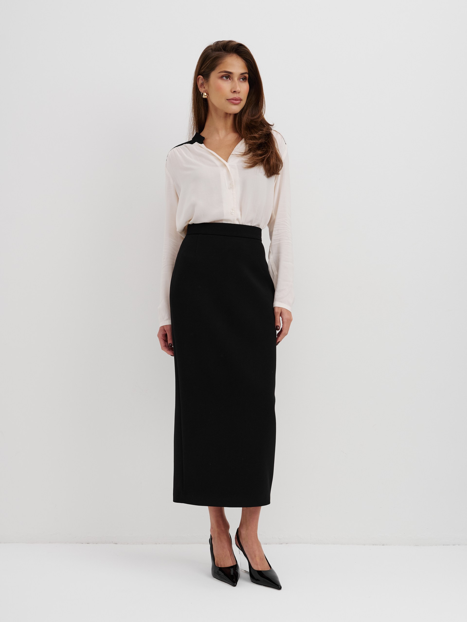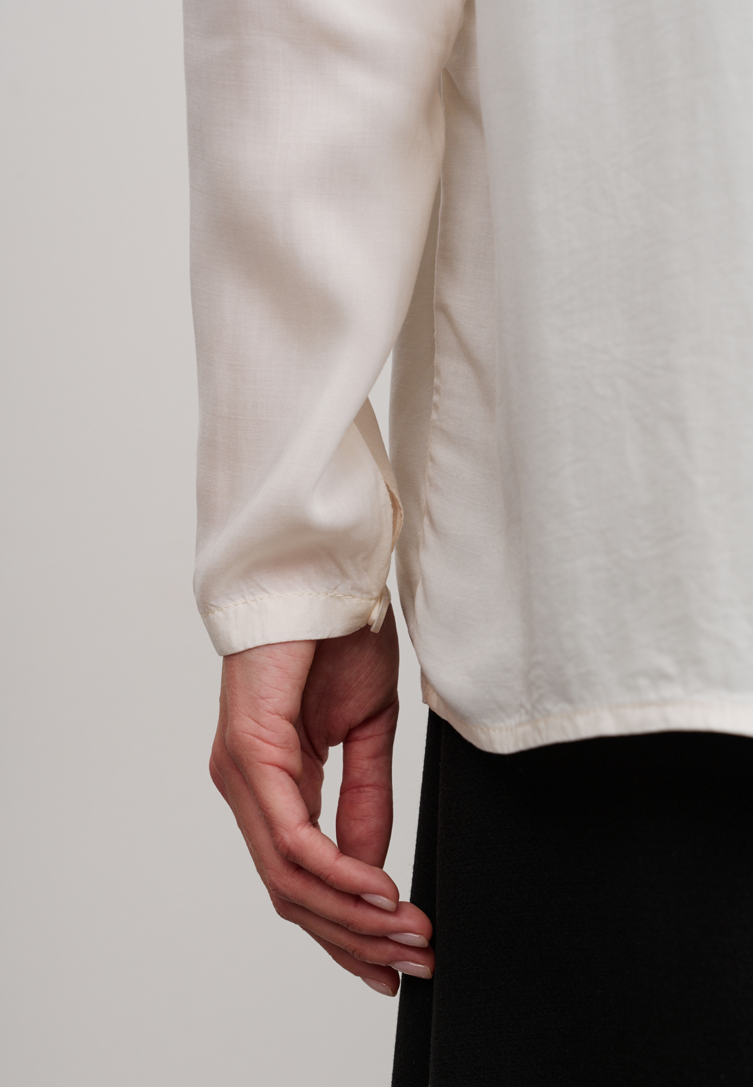 Блуза из 100% вискозы. Воротник стойка плавно перетекает в акцентную планку выполненную в черном цвете. На рукаве выполнен разрез и застежка на пуговицу. Блуза застегивается на пуговицы.