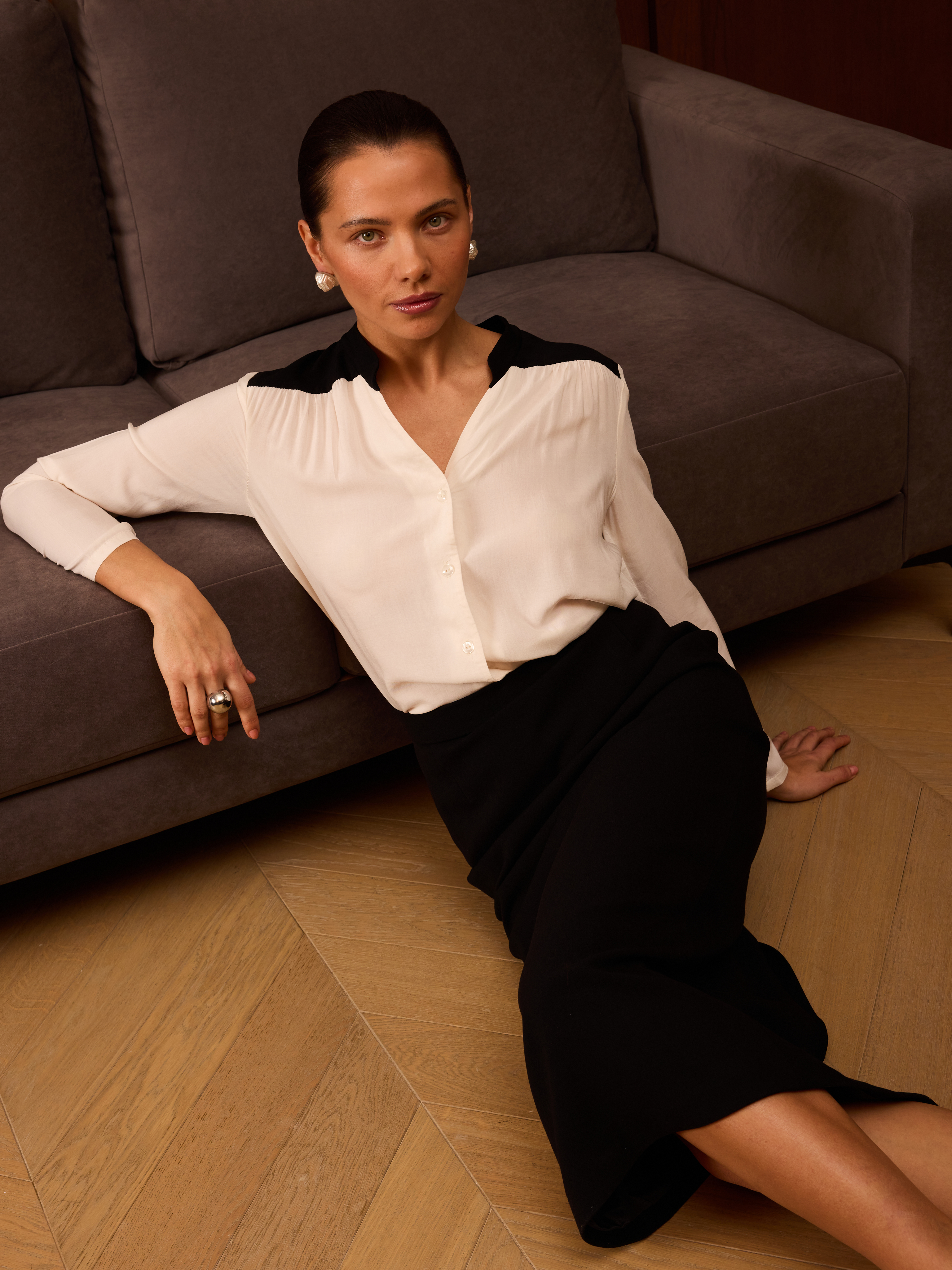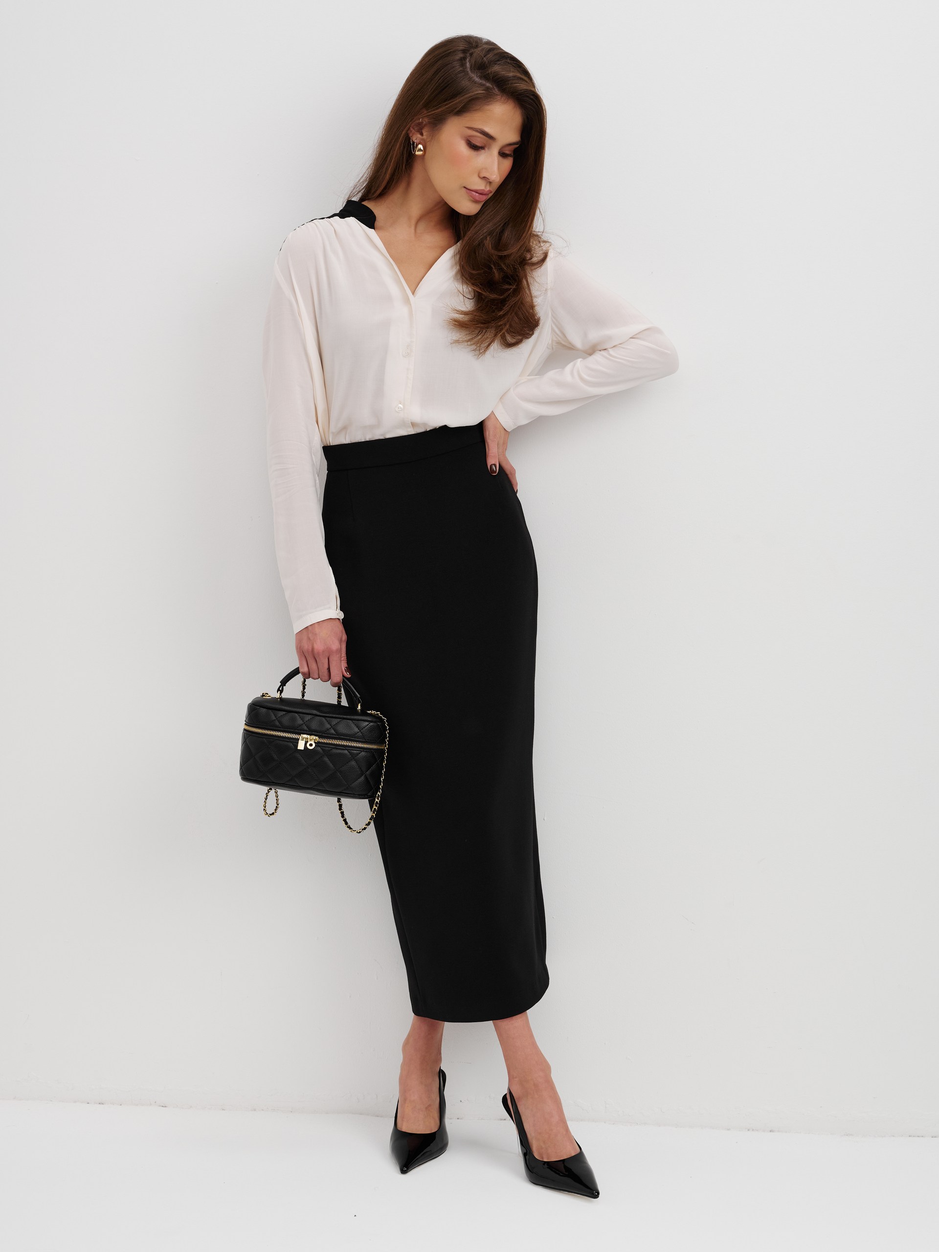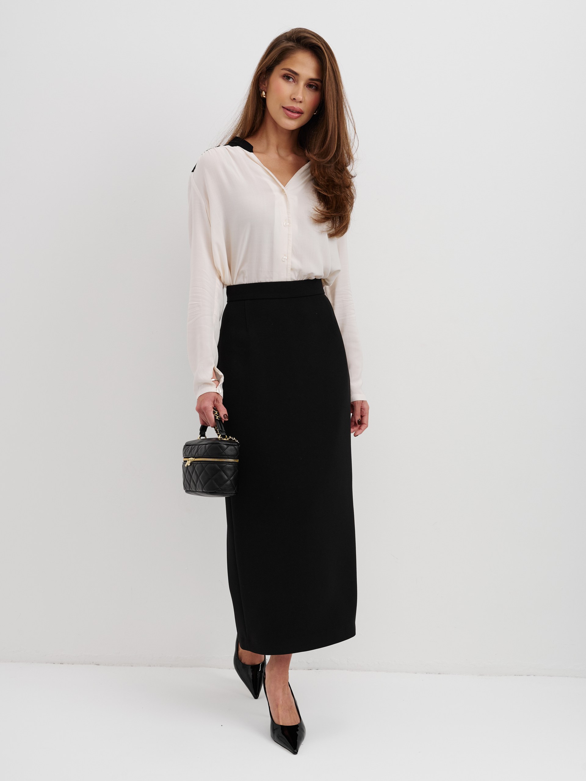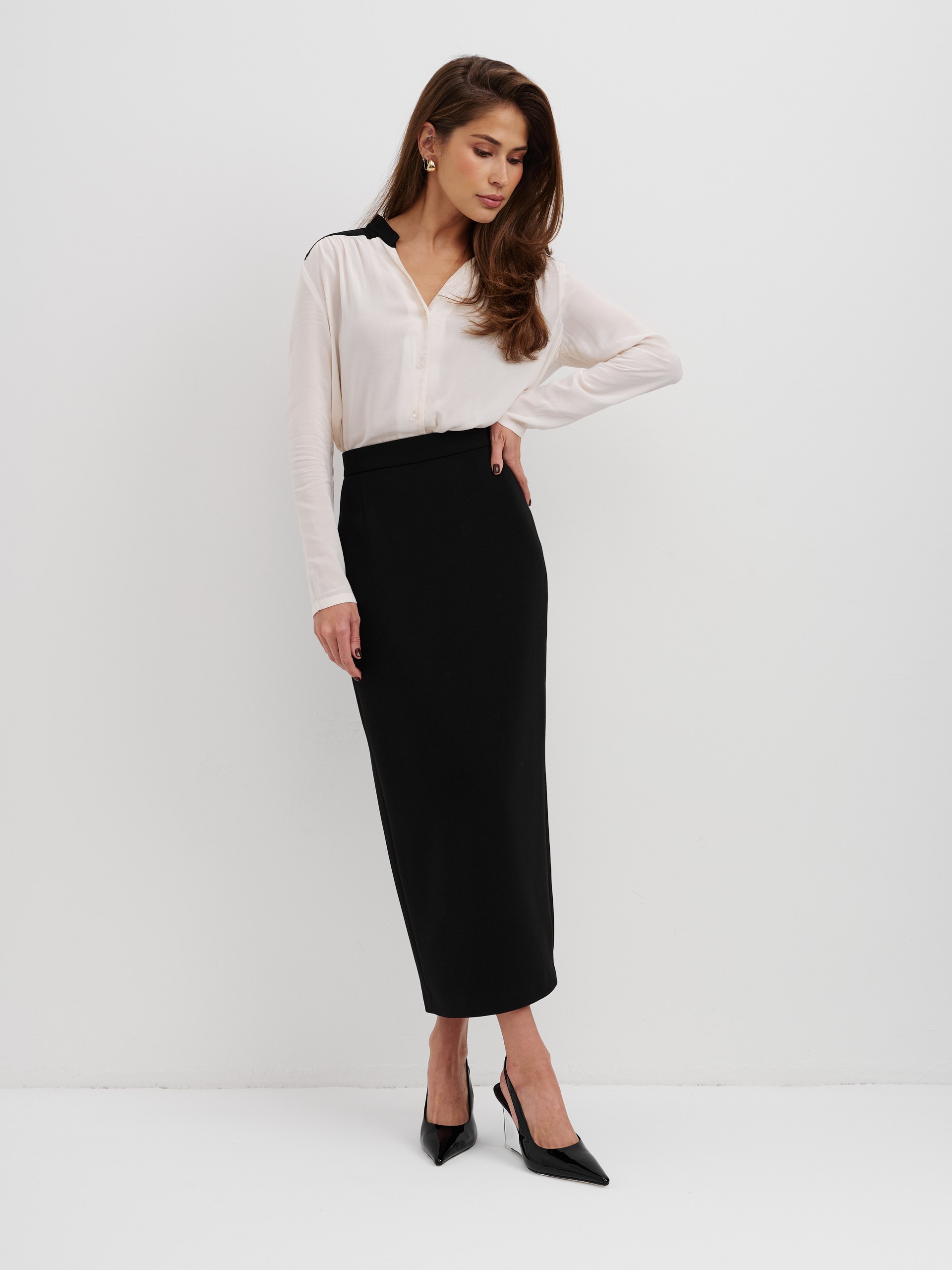 Блуза из 100% вискозы. Воротник стойка плавно перетекает в акцентную планку выполненную в черном цвете. На рукаве выполнен разрез и застежка на пуговицу. Блуза застегивается на пуговицы.