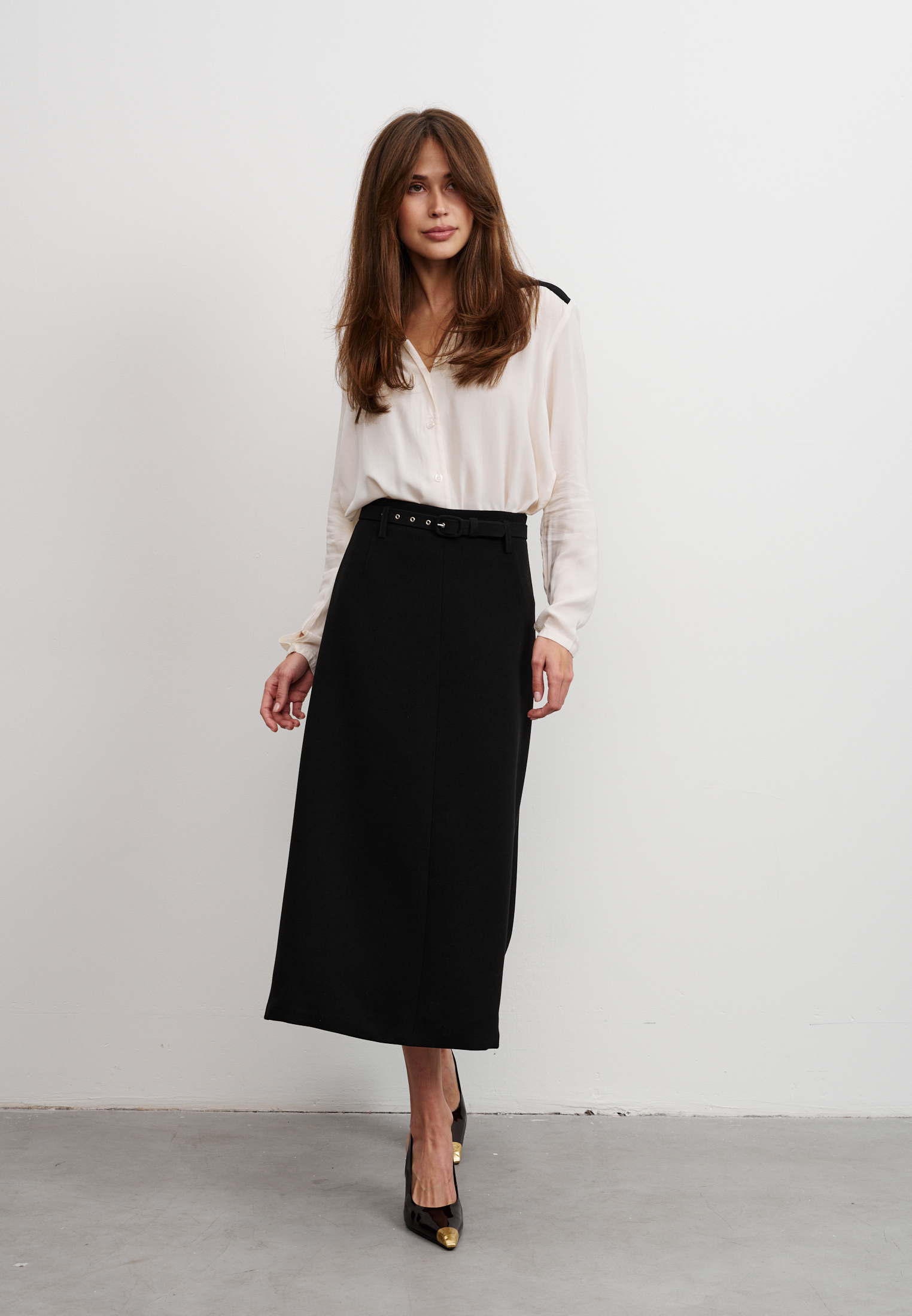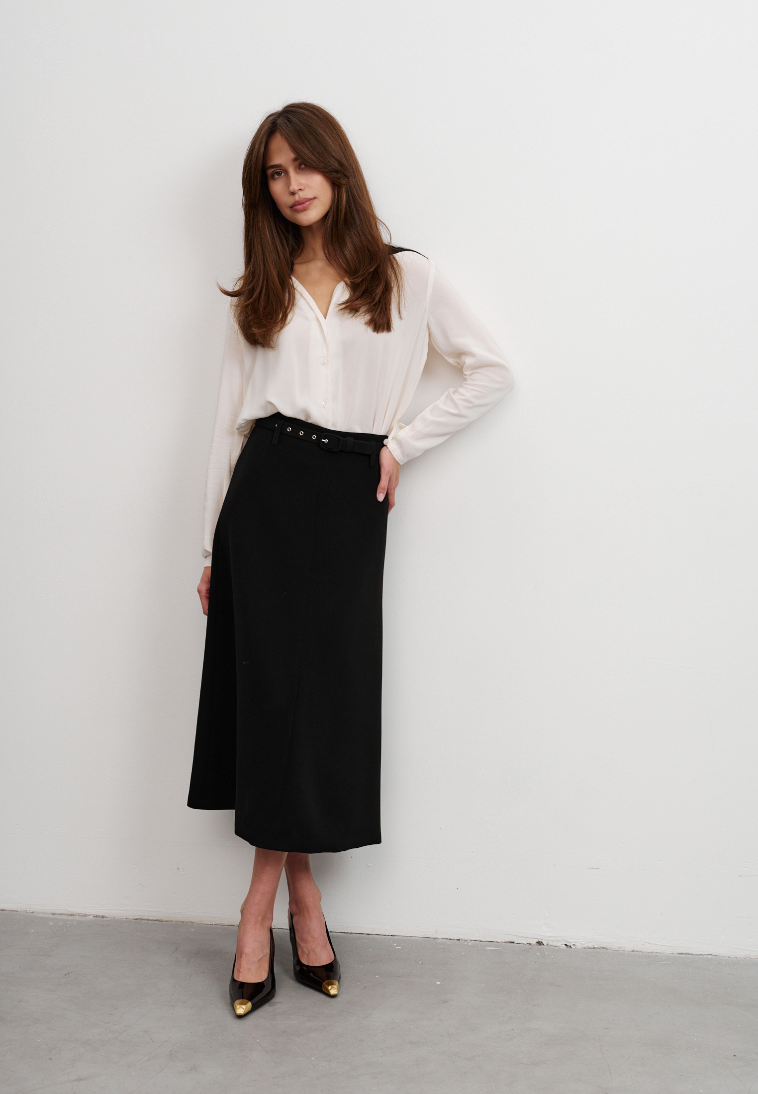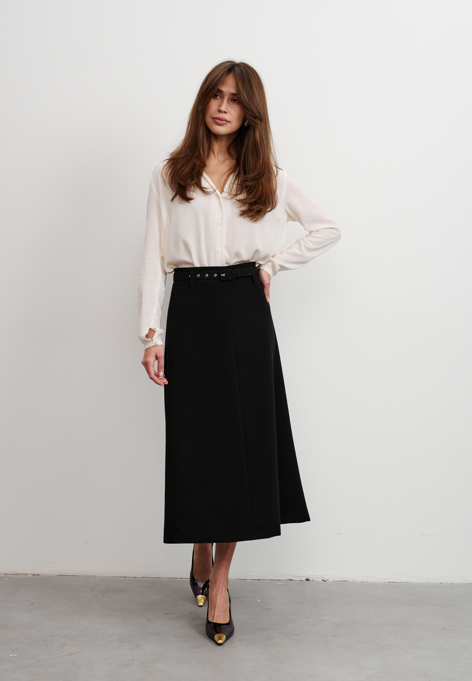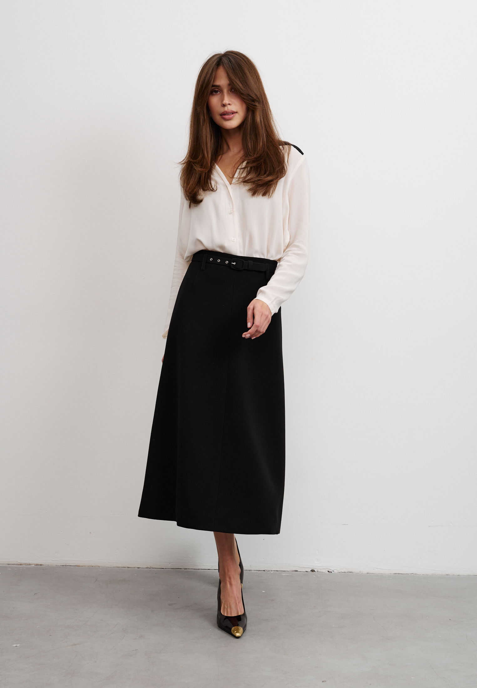 Блуза из 100% вискозы. Воротник стойка плавно перетекает в акцентную планку выполненную в черном цвете. На рукаве выполнен разрез и застежка на пуговицу. Блуза застегивается на пуговицы.