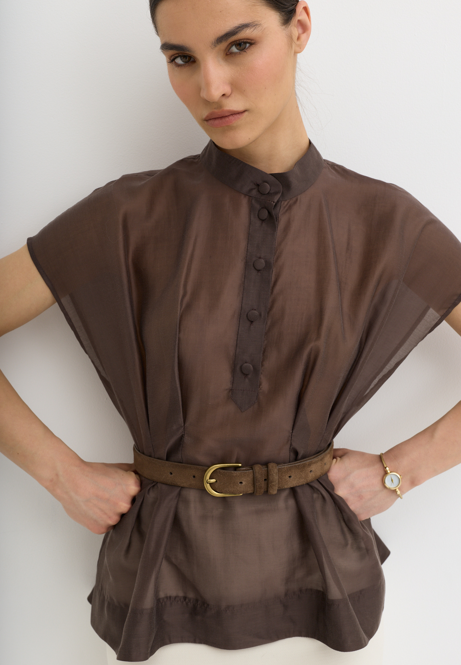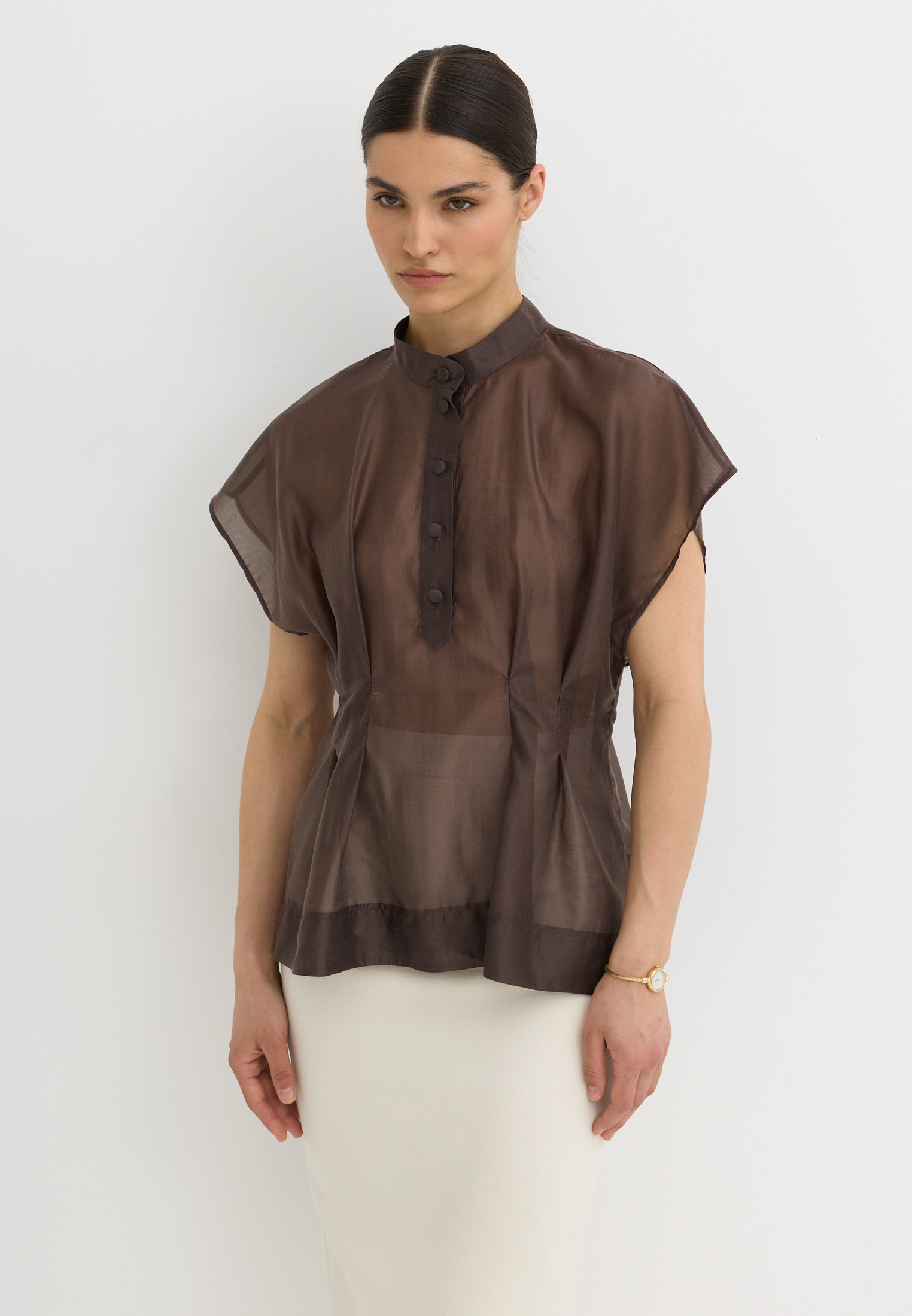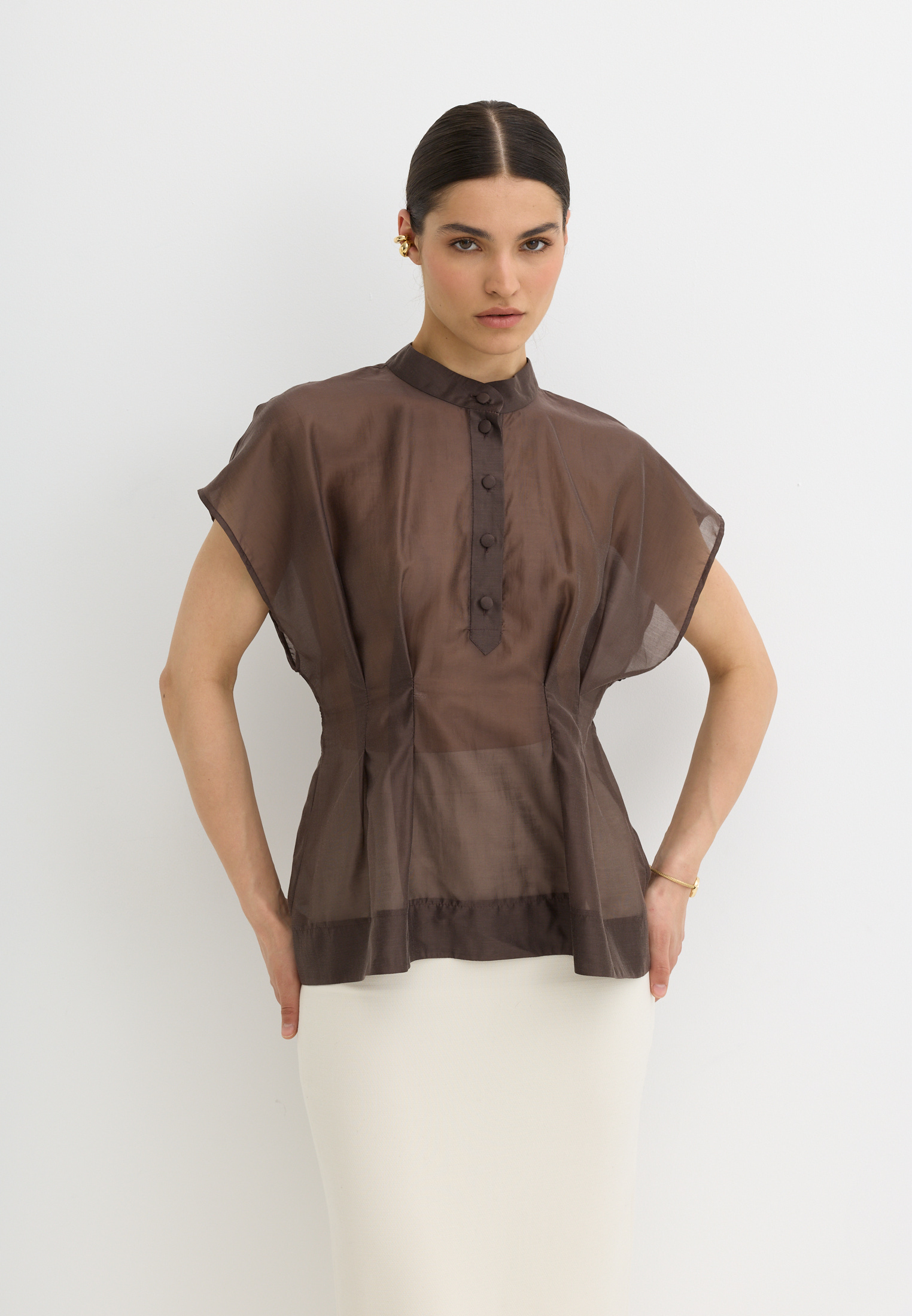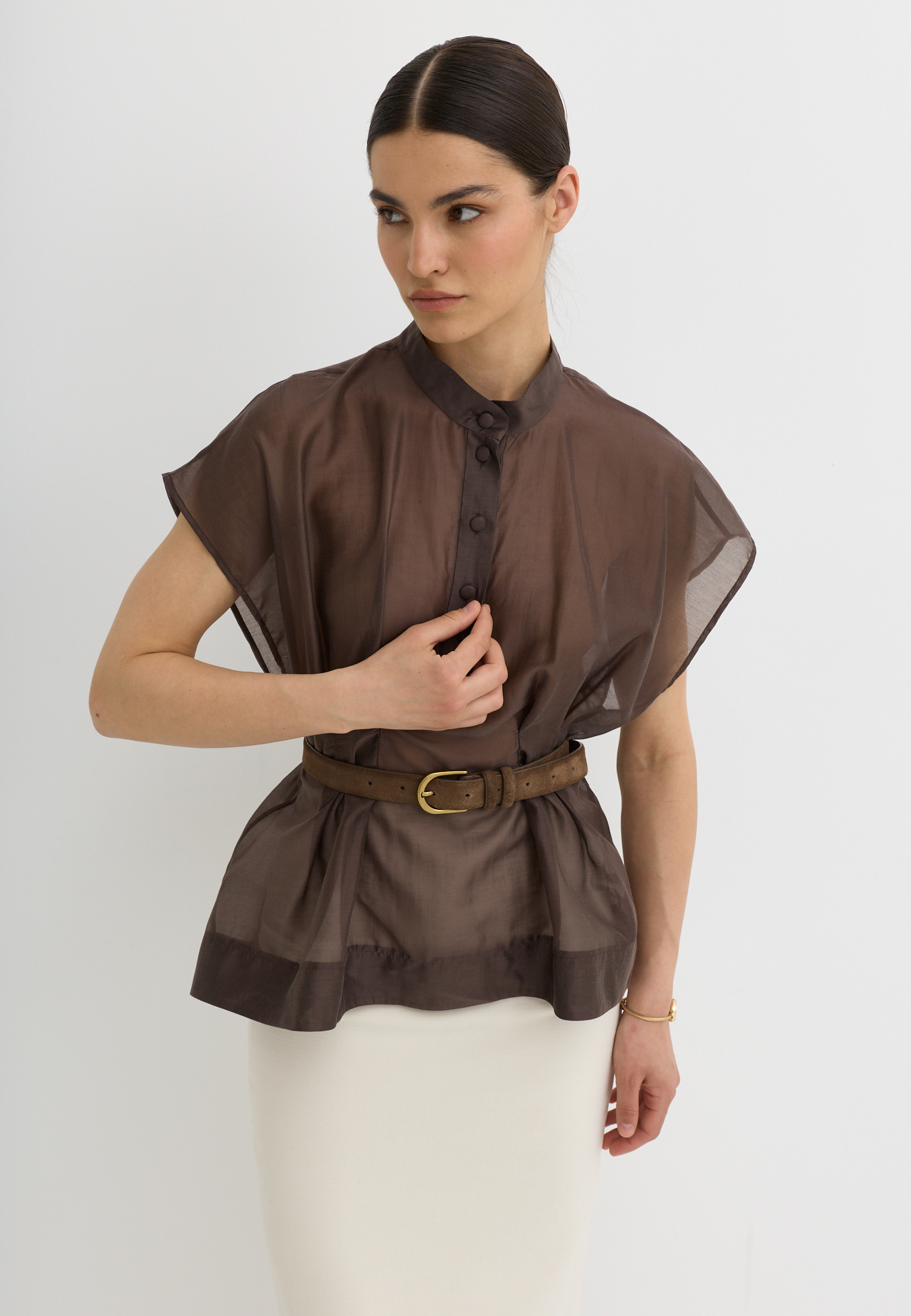 Легкая, воздушная блузка приталенного кроя, выполненная из тенселя. Тенсель - текстильный материал, который производят из древесной целлюлозы эвкалипта по экологичной технологии. По ощущениям напоминает мягкий хлопок или шёлк, но при этом обладает прочностью, хорошей воздухопроницаемостью и антибактериальными свойствами.