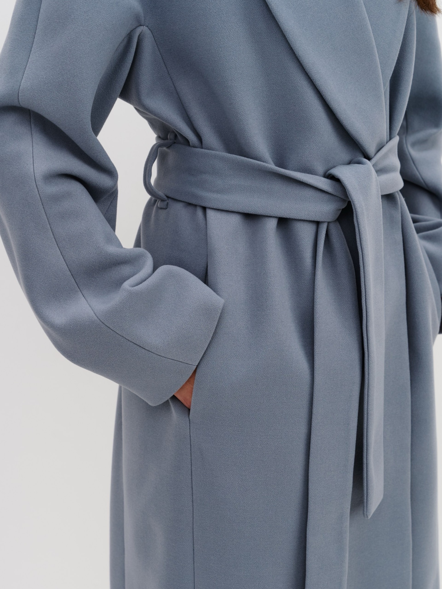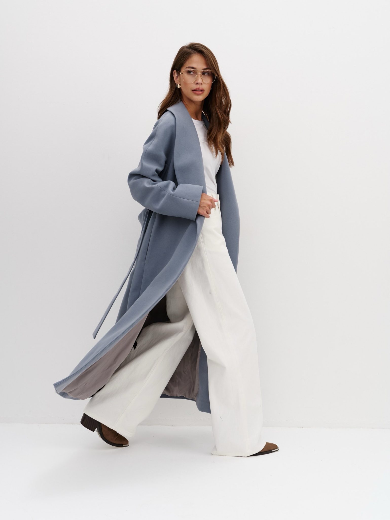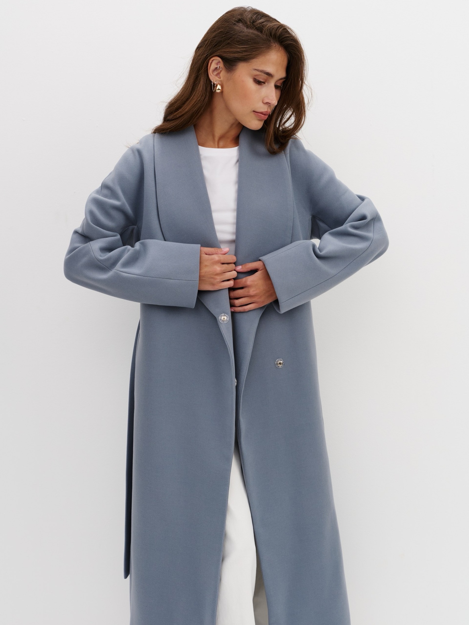 Пальто-халат свободного силуэта в длине макси. Модель выполнена с шалевым воротником, который при запахе образует V-образный вырез и визуально удлиняет линию шеи. Изделие можно “перехватить” в талии поясом, создав четкую структурированную форму как альтернативу силуэту “песочный часы”. Имеются функциональные карманы. Застежка выполнена в виде пришивных кнопок.