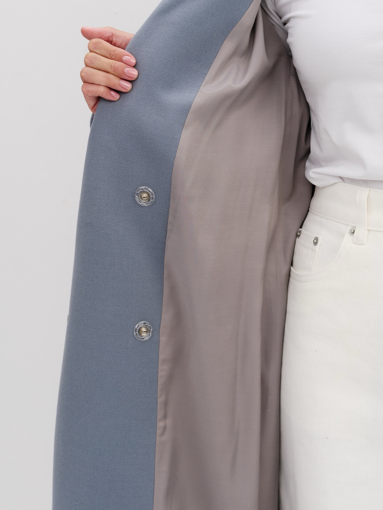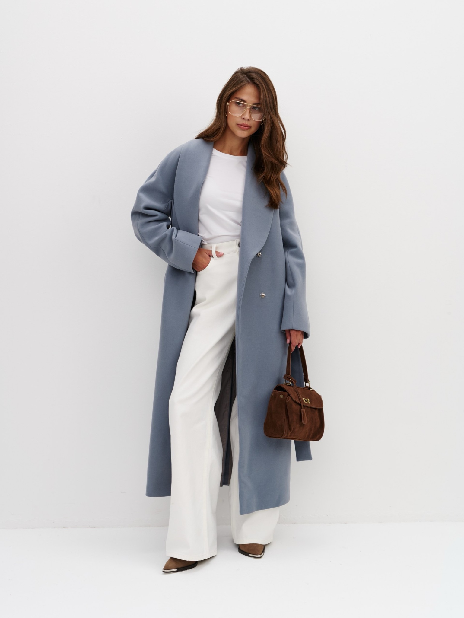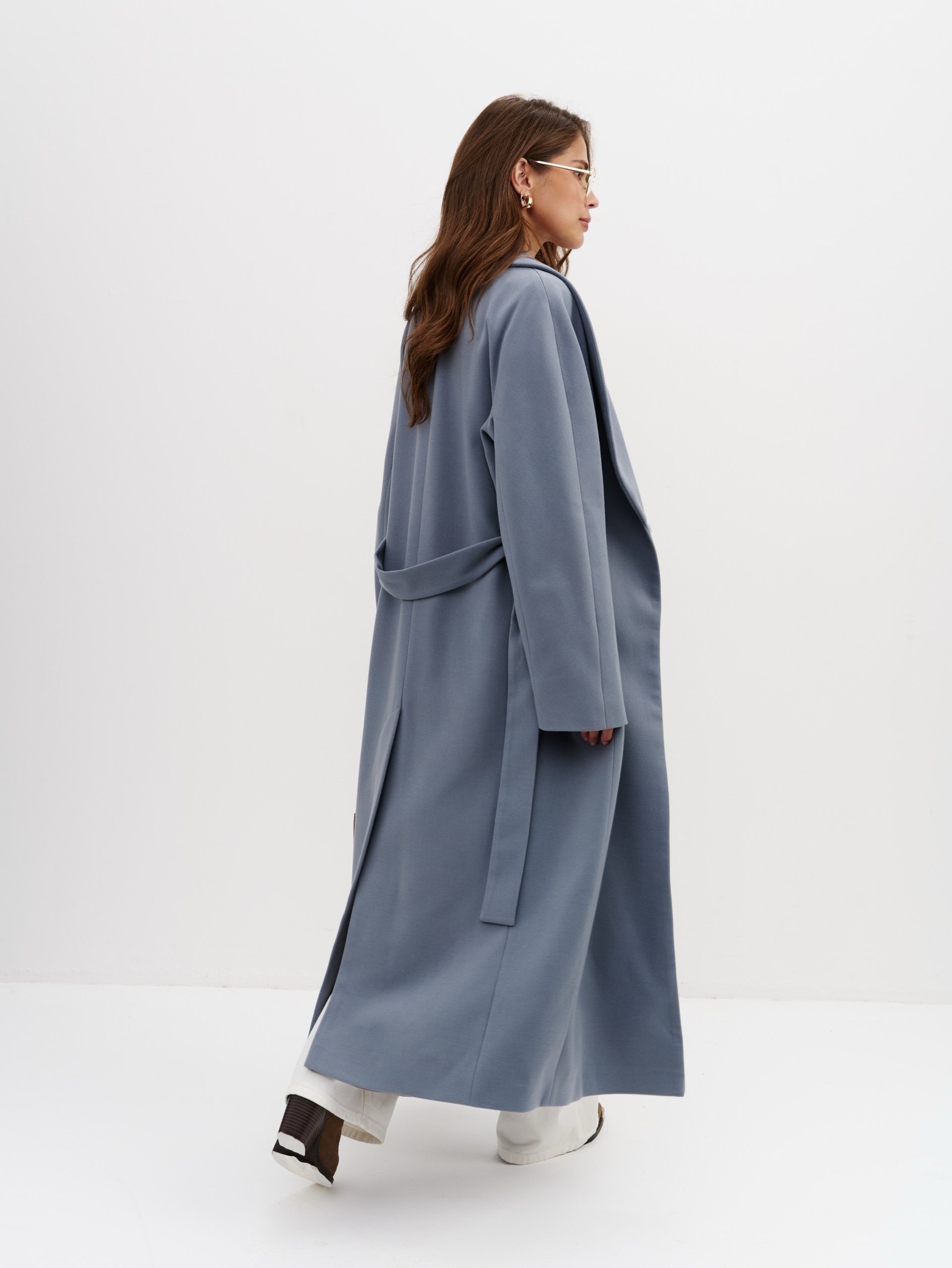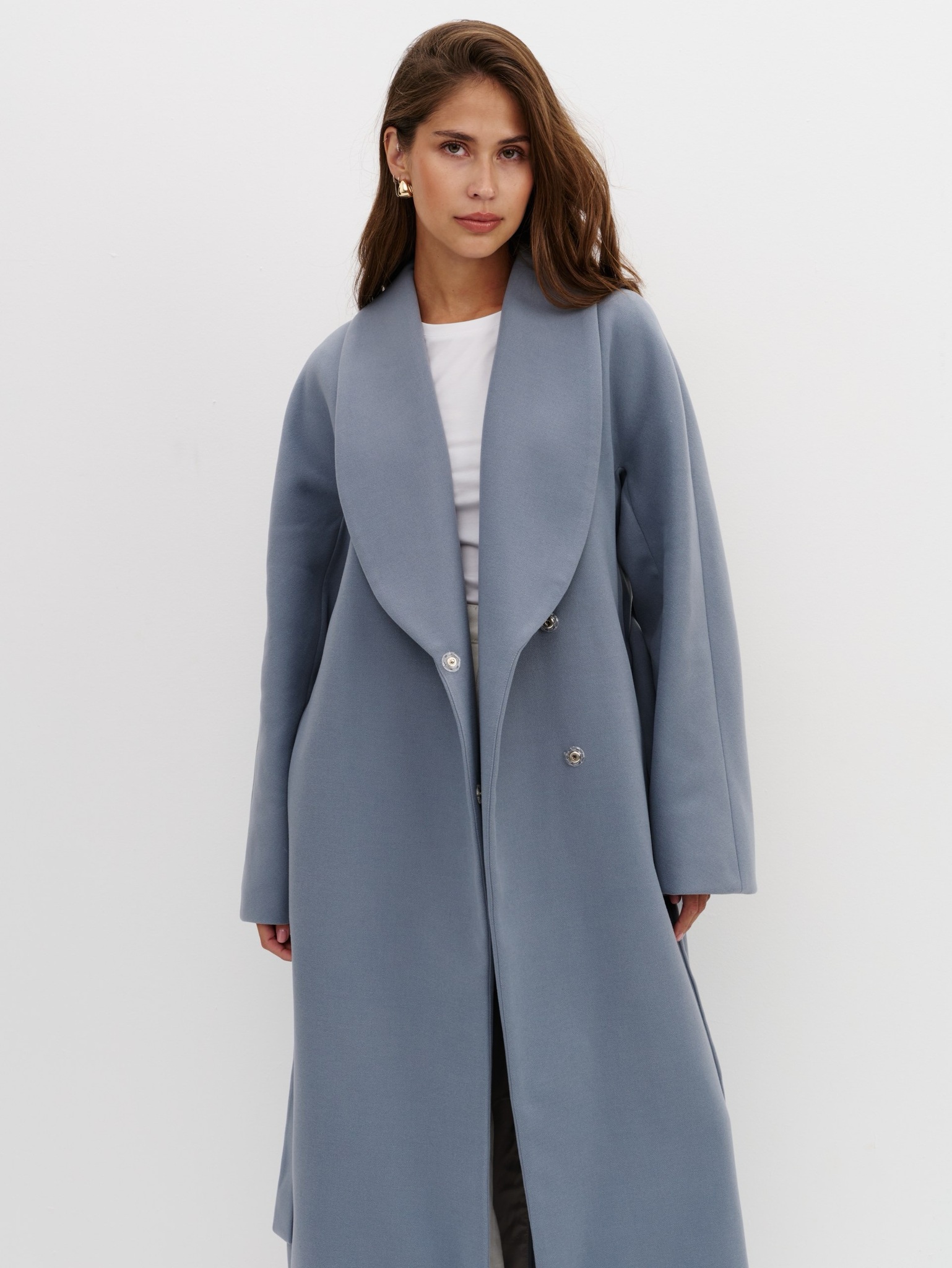 Пальто-халат свободного силуэта в длине макси. Модель выполнена с шалевым воротником, который при запахе образует V-образный вырез и визуально удлиняет линию шеи. Изделие можно “перехватить” в талии поясом, создав четкую структурированную форму как альтернативу силуэту “песочный часы”. Имеются функциональные карманы. Застежка выполнена в виде пришивных кнопок.