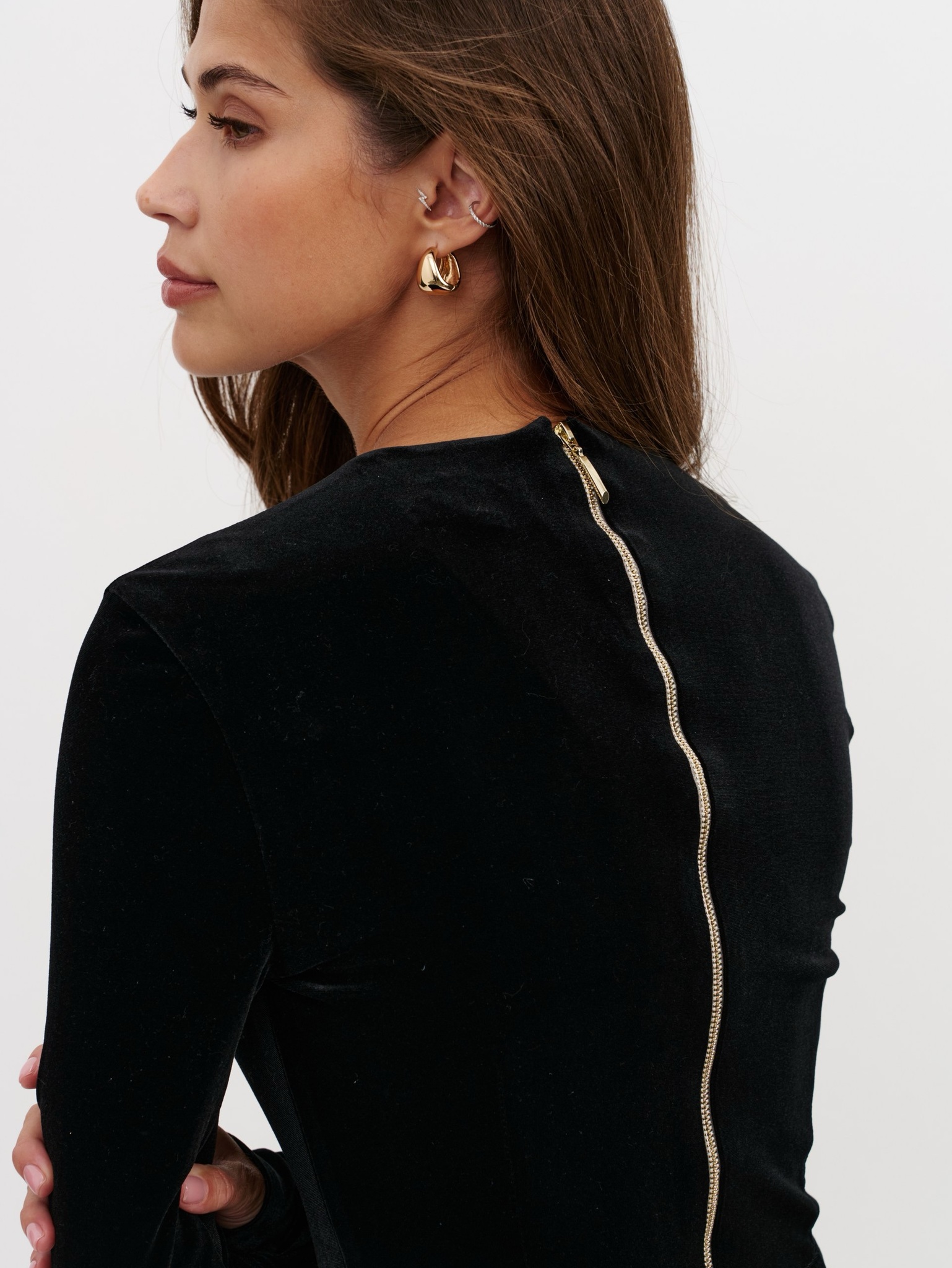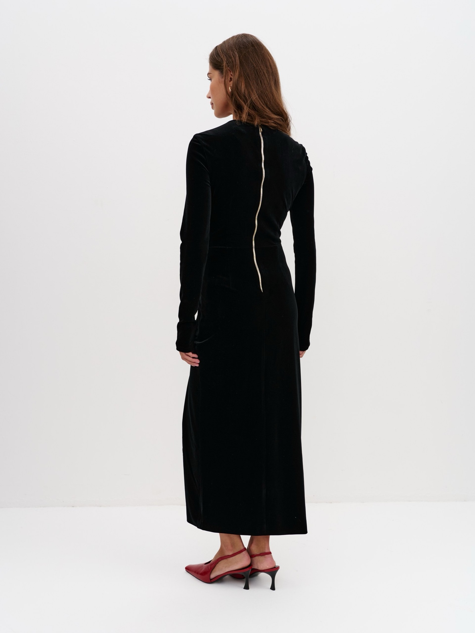 Платье выполнено из нежного тонкого бархата на трикотажной основе с выразительным блеском. Модель приталенного силуэта с круглым горловым вырезом, длинными рукавами, с акцентным разрезом вдоль ноги, подчеркнутым драпировкой. Сзади выполнена декоративная молния. Платье на подкладе из тонкого струящегося материала, не электролизуется.