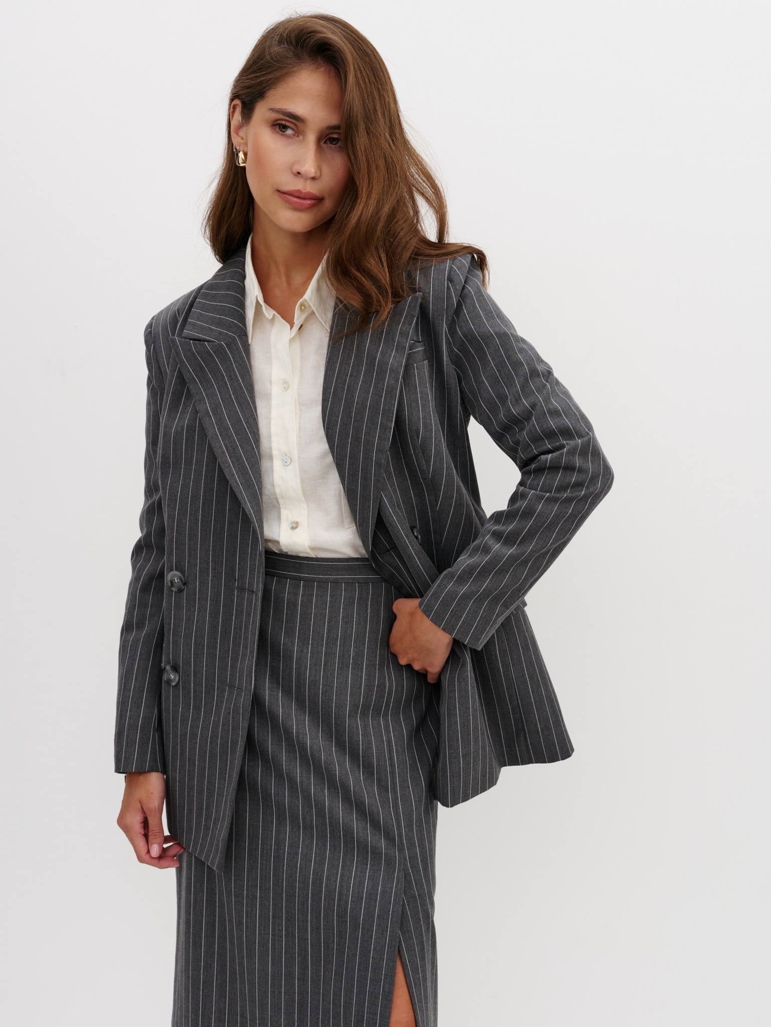 Двубортный жакет, умеренного объёма, трендового прилегающего силуэта. Жакет выполнен из костюмного текстиля средней плотности с трендовой фактурной полоской. Ткань с высоким содержанием шерсти, мягко прилегает и обеспечивает комфорт. Жакет полностью на подкладке из поливискозы.